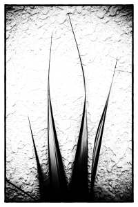 A study in contrasts, this monochrome image captures the sharp elegance of plant leaves rising against a textured wall. The stark black-and-white treatment emphasizes form, shadow, and negative space, creating a minimalist composition that evokes resilience and quiet strength.
