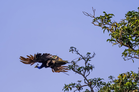 It was interesting to watch an indian peafowl taking off from a mango tree to come to the ground.