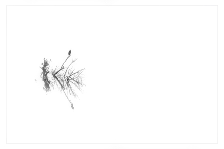 A solitary bird perches on a fragile branch, mirrored in the calm water below. The vast negative space enhances the sense of silence and isolation, transforming simplicity into a profound moment of meditation. The high-key minimalism strips away distractions, leaving only serenity and balance.