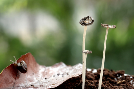 A quiet moment unfolds on the forest floor: a lone snail inches across a brittle leaf, while three slender mushrooms rise like sentinels from the soil. Their delicate stems and curled caps echo the fragility of life in miniature. This image captures the hush of nature’s slow choreography—where decay, growth, and movement coexist in silent harmony.